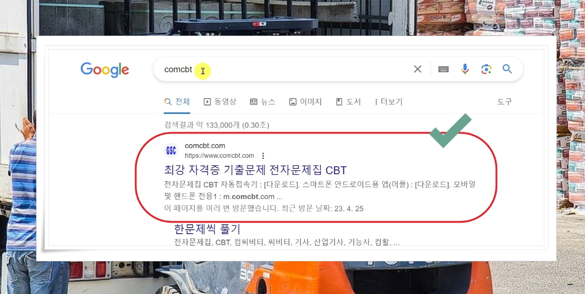 5. 이번에는 지게차운전기능사 필기 기출문제 자료를 얻는 방법을 알려드리겠습니다. HWP 파일과 PDF 파일 이렇게 2가지 문서 포맷으로 되어 있는 자료를 받아볼 수 있습니다. comcbt 사이트를 통해 해당 자료를 구할 수 있는데요. comcbt 닷컴 사이트에 접속해 주세요.