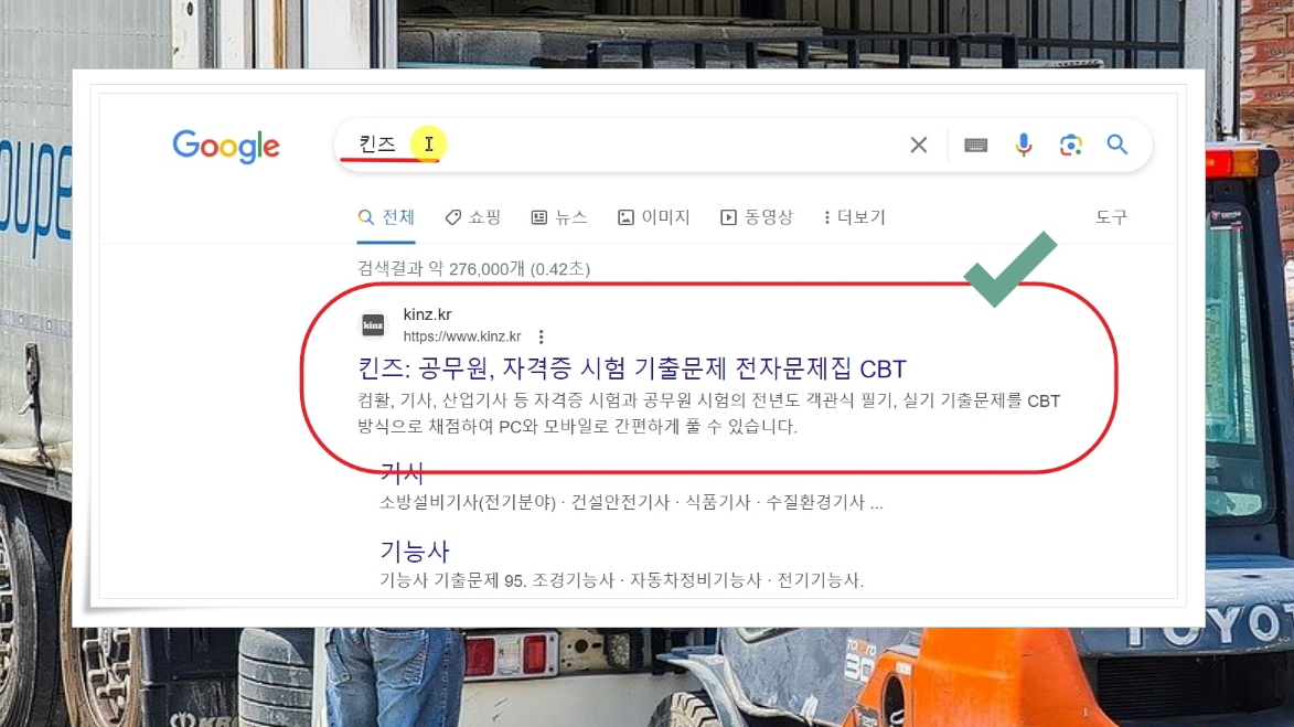 1. 그럼 먼저 온라인으로 지게차운전기능사 기출문제를 푸는 방식을 알려드리겠습니다. 여러 가지 시험에 대한 기출문제 서비스를 제공하는 킨즈 사이트를 이용하면 되는데요. 여기서 지게차 필기시험을 무료로 준비할 수 있습니다.