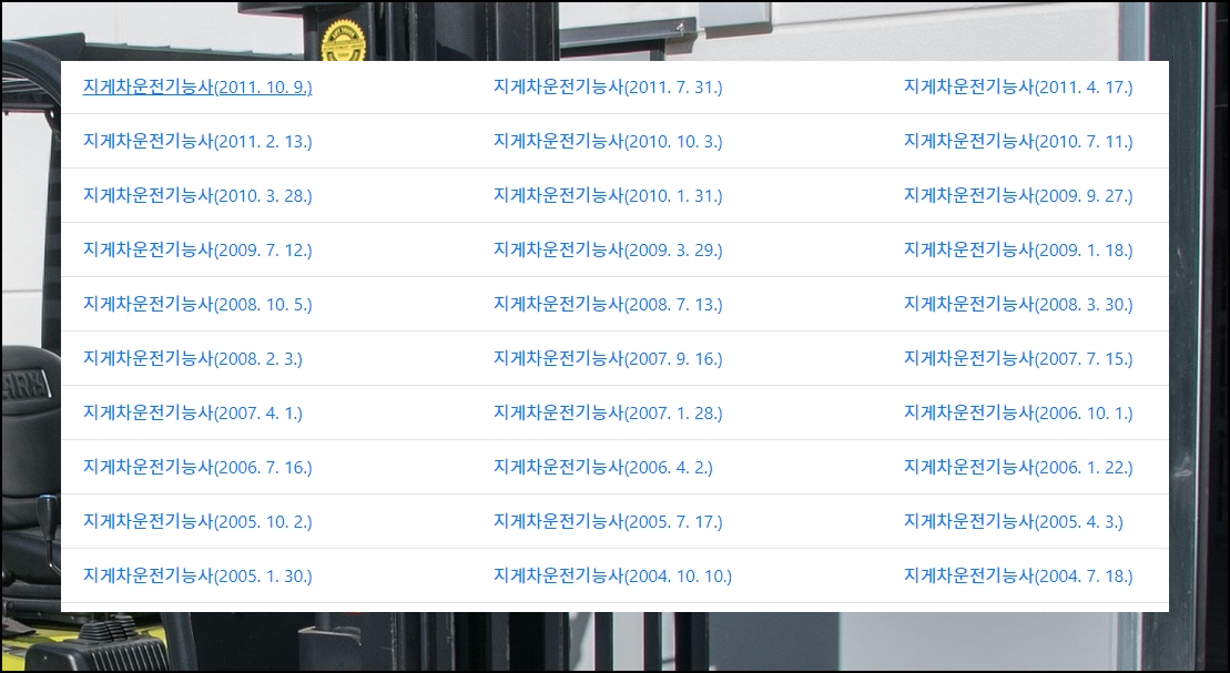 여러 회차의 지게차운전기능사 필기 시험 중에서 하나를 선택해 주세요. 연도를 보면 옛날에 시행된 필기 시험 문제가 많지만, 크게 문제될 것은 없다고 봅니다. 시험 내용이 크게 바뀐 것은 없거든요.
