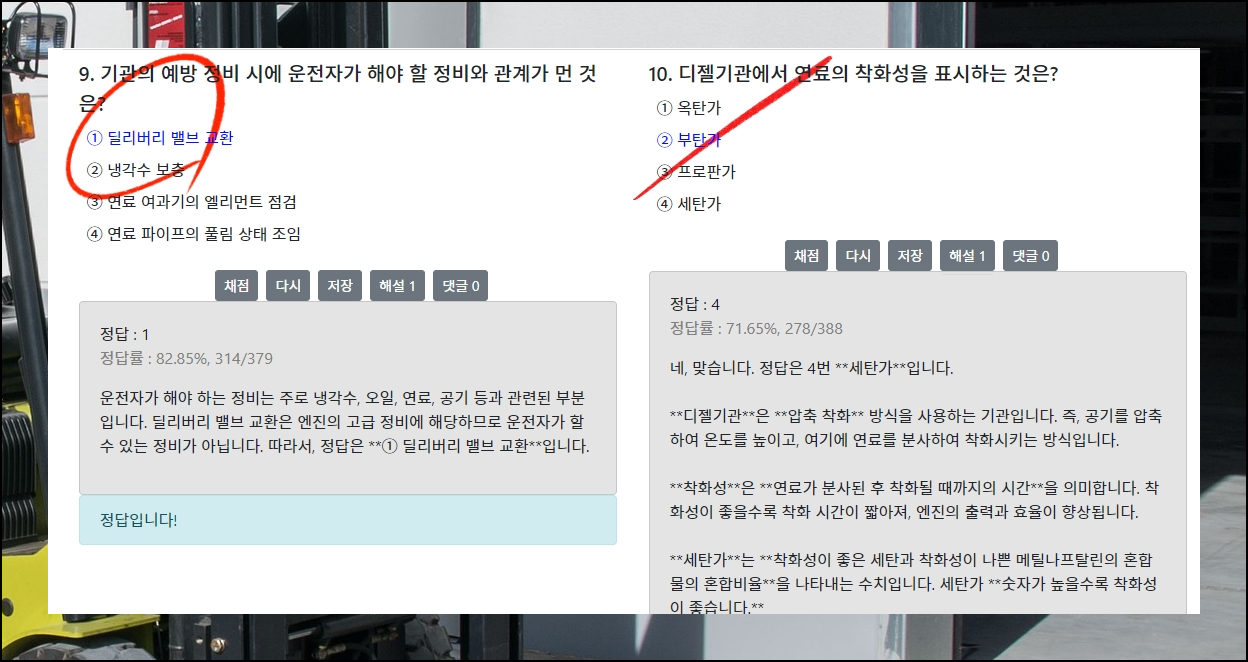 어떤 문제를 풀던 이렇게 해석을 볼 수 있는 것이 좋습니다. 그래야 틀린 문항을 다시 틀리지 않을 수 있거든요. 해설을 통해 모르는 내용을 공부하면 되기 때문입니다. 지게차운전기능사 필기 시험을 혼자 준비하는 분들에게 유용한 서비스를 알려드릴게요.
