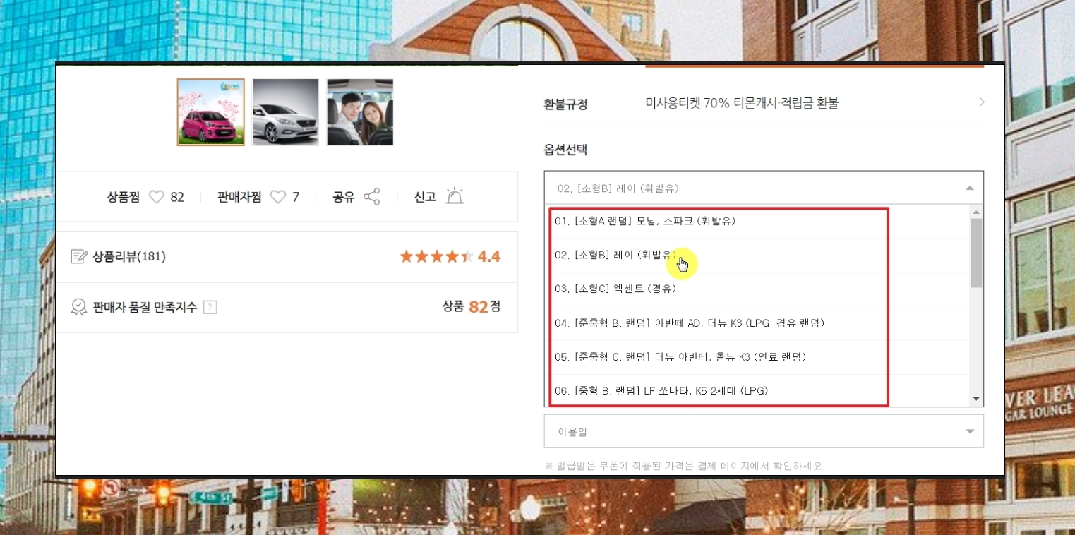 차량 렌트 비용이 저렴해 보이는 업체의 상품을 골라 보았습니다. 옵션 지정해 보면 차량 선택을 할 수 있습니다. 모닝, 스파크, 레이, 엑센트, 아반떼, K3 등 다양한 모델 중에서 선택이 가능합니다.