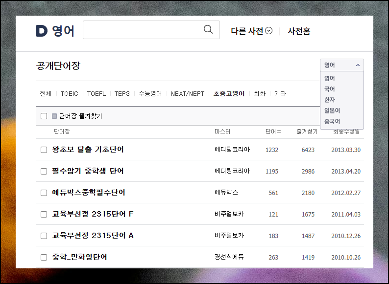 공개 단어장 화면에서는 우측 상단에서 다양한 언어 옵션을 고를 수 있어요. 초등 학생용 영어 어휘뿐 아니라 토익, 토플, 텝스, 수능용 등 여러 가지 자료가 준비되어 있습니다. 1000개가 넘는 단어 모음을 통해 수준별로 배울 수 있어요.