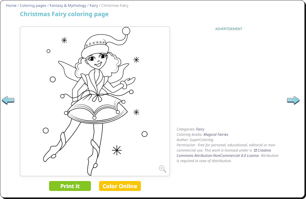 는 마법의 요정을 선택해 보았는데요. 아이들이 좋아할 만한 그림이네요. 마음에 드는 그림을 클릭하면 이렇게 인쇄 버튼("Print it")과 온라인 그리기 버튼("Color Online")이 있습니다. 두 가지 서비스 모두 무료로 제공되는 서비스이기 때문에 마음껏 눌러서 이용하면 돼요.