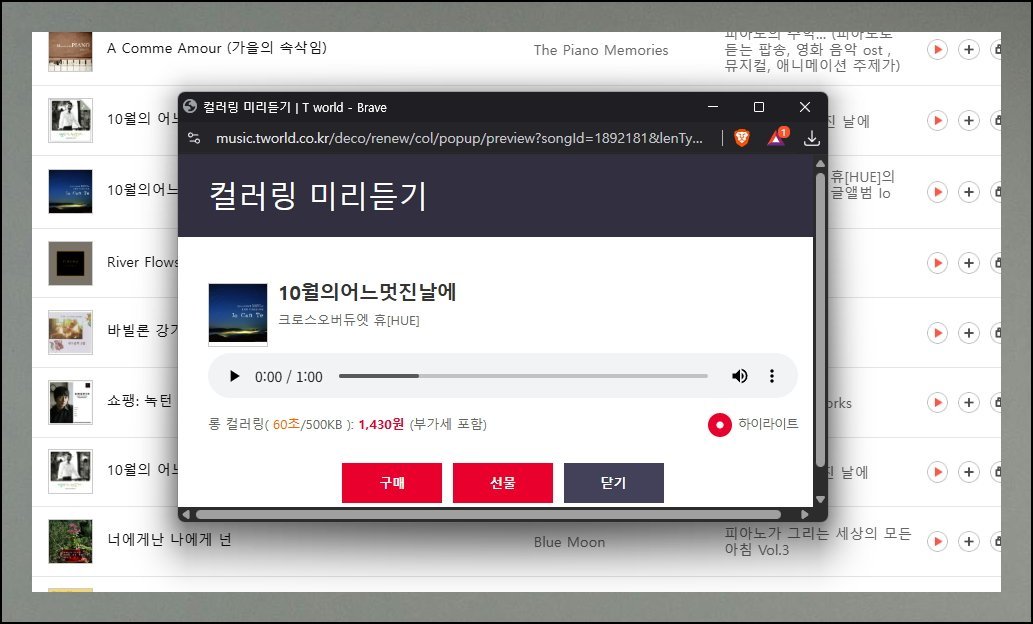 이곳에서 눈에 띄는 트랙을 발견하셨나요? 리스트에서 플레이 표시만 탭하면 핵심 부분을 즉시 감상 가능해요. 각 트랙에는 이용 금액이 분명하게 안내되어 있습니다. 결제 버튼을 누르면 대기음에 바로 반영되고요. 지인에게 전달하고 싶다면 선물하기 기능을 써보세요.