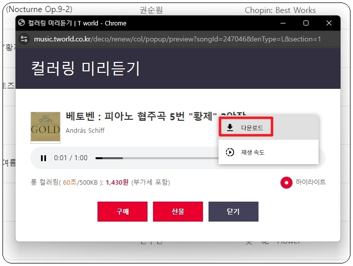각 음원 옆에 보면 재생 버튼이 있는데요. 해당 버튼을 클릭해 보세요. 그럼 컬러링 음원을 미리듣기 할 수 있는 창이 나타납니다. 이것을 통화연결음으로 사용할 때 얼마의 비용을 내야 하는지 명확하게 표시되어 있죠. [구매] 버튼을 누르면 자신의 폰에 설정하는 것이고, [선물] 버튼을 통해 남에게 선물을 해줄 수 있습니다. 이러한 선물을 받으면 기분이 좋을 것 같아요.