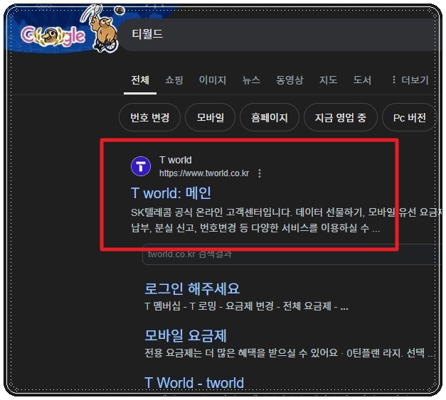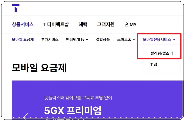그럼 본격적으로 최신 업데이트 되는 인기 노래 순위를 스마트하게 확인하는 방법을 알려드리겠습니다. 참고로 해당 방법을 통해 음원을 다운로드 받는 것도 가능합니다. 물론 컬러링으로 사용하기 위해서는 통신사에 요청을 해야 하는 것이기 때문에 다운 받은 음원은 감상용이나 벨소리용으로만 사용할 수 있어요. 그럼 "티월드" 사이트에 접속해 주세요. 사이트에 접속하면 "모바일 전용 서비스" 메뉴에서 "컬러링"을 찾아서 선택해 줍니다.