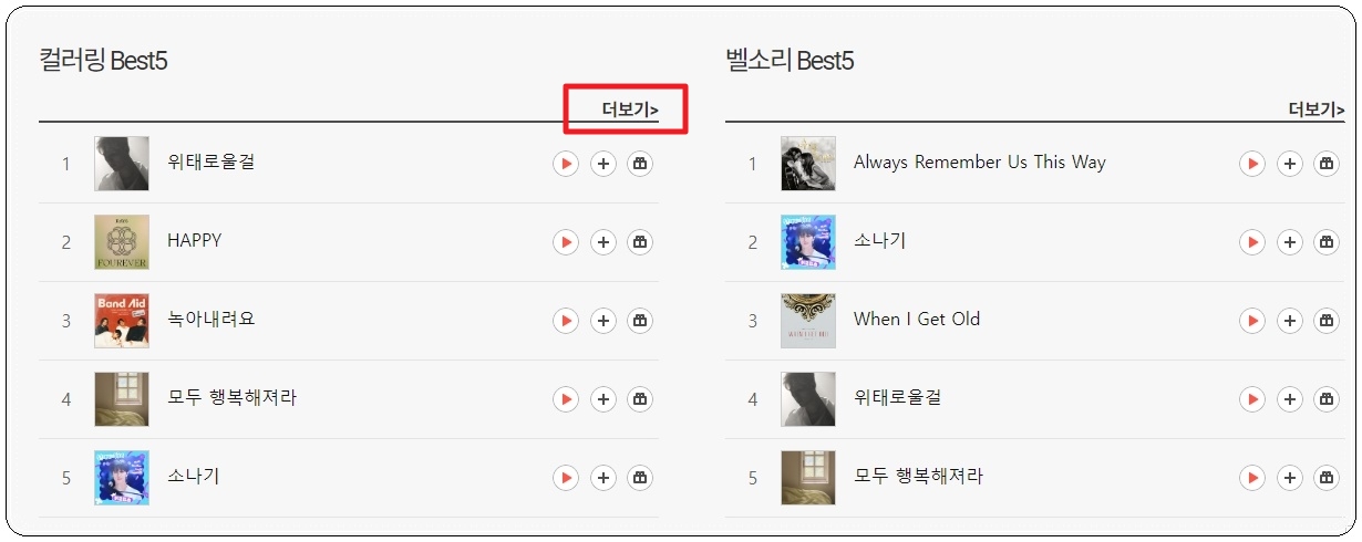 Best5를 통해 컬러링과 벨소리로 하기 좋은 노래 5개씩을 볼 수 있는데요. 이 정도만 보면 너무 아쉽죠. 리스트 우측 상단에 있는 [더보기] 버튼을 눌러줍시다. 표가 나타나면서 인기곡, 최신곡, 장르별 컬러링 하기 좋은 노래 순위를 볼 수 있게 되어 있는데요. 꽤 많은 데이터가 있으니 스크롤을 내려서 직접 확인해 보세요.