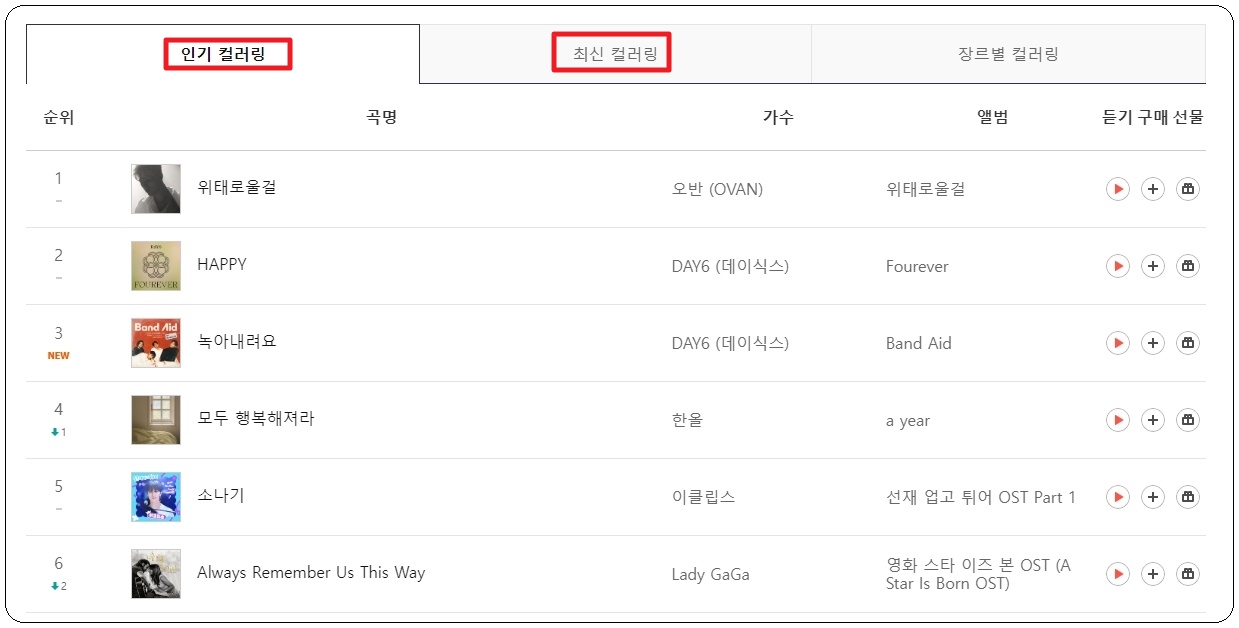 많은 사람들에게 좋은 평가를 받는 노래나 인기 순위는 매번 바뀔 수 밖에 없습니다. 그렇기 때문에 매번 새롭게 업데이트가 되는 컬러링 순위를 확인하는 것이 좋은데요. 일단 현재 기준으로 1위부터 18위에 해당하는 인기 컬러링 리스트를 조회해 보았습니다. 오반, DAY6, 한올, 이클립스, 레이디 가가 등 노래 잘 부르는 가수들의 곡이 많이 보이네요.