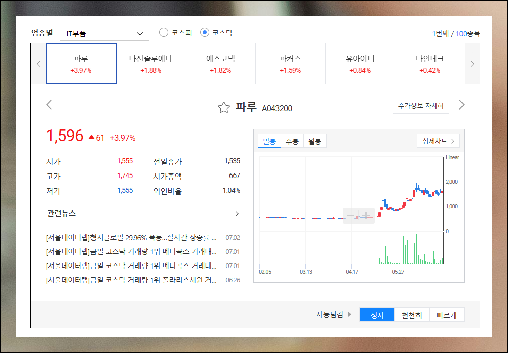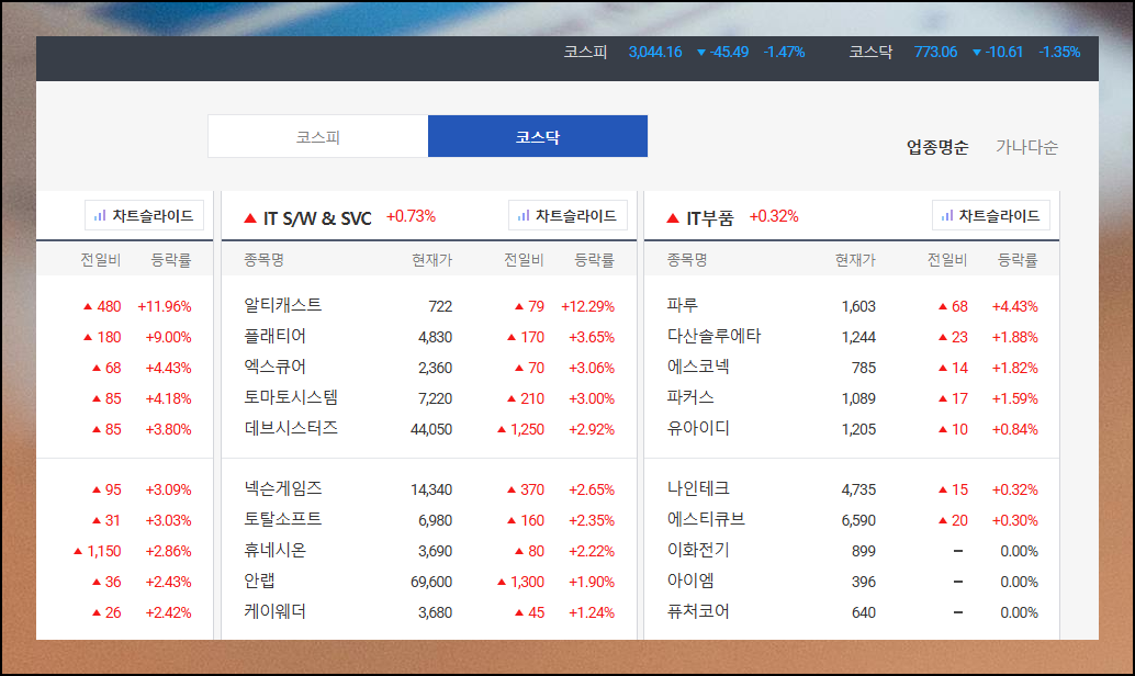 실제 사례로 코스닥의 IT 부품 업종을 선택해서 살펴보겠습니다. 업종을 클릭하면 그 업종에 포함된 주식들의 상세 정보가 나타나요. 자동으로 일정 시간마다 다른 주식 정보로 넘어가는 기능이 있어서 여러 주식을 연속으로 확인할 수 있습니다.