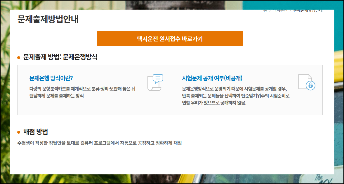 "드라이버스"라는 운전기사 전문 구인구직 사이트에서 택시운전 자격시험 문제집을 무료로 풀어볼 수 있어요. 별도의 비용 부담 없이 실제 평가와 유사한 문항들을 풀어볼 수 있습니다.