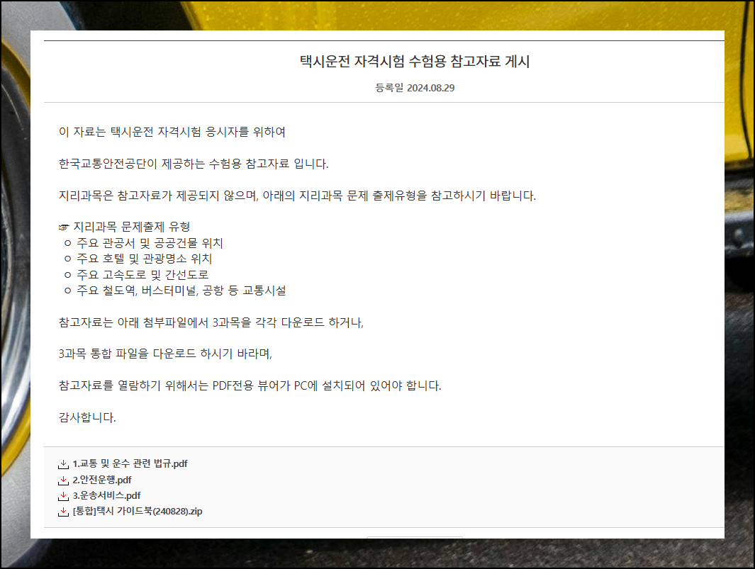 여러 페이지에 걸쳐 체계적으로 정리된 이 자료는 안전운행 요령과 운송서비스, 교통 및 운수 관련 법규까지 모든 영역을 다루고 있습니다. "택시운전 자격시험 수험용 참고자료 게시" 페이지를 찾아 접속해 주세요. TS국가자격시험 사이트의 웹페이지를 선택해야 합니다.