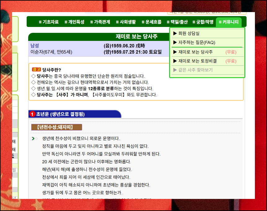 총괄 운세와 월간 운세를 다 보셨다면 이제 당사주 부분을 확인해보시기 바랍니다. 비용 없이 제공되는 당사주에서는 훨씬 더 전문적인 점술 정보를 접할 수 있어요.