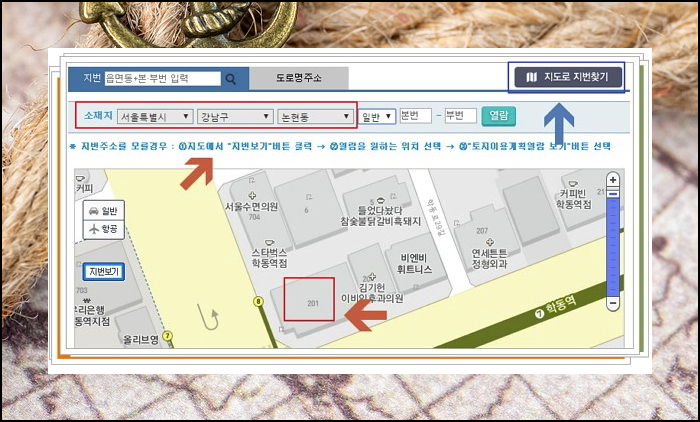 무슨 동인지도 모르겠다고 하시면 우측 상단에 '지도로 지번찾기'를 이용하시면 됩니다.