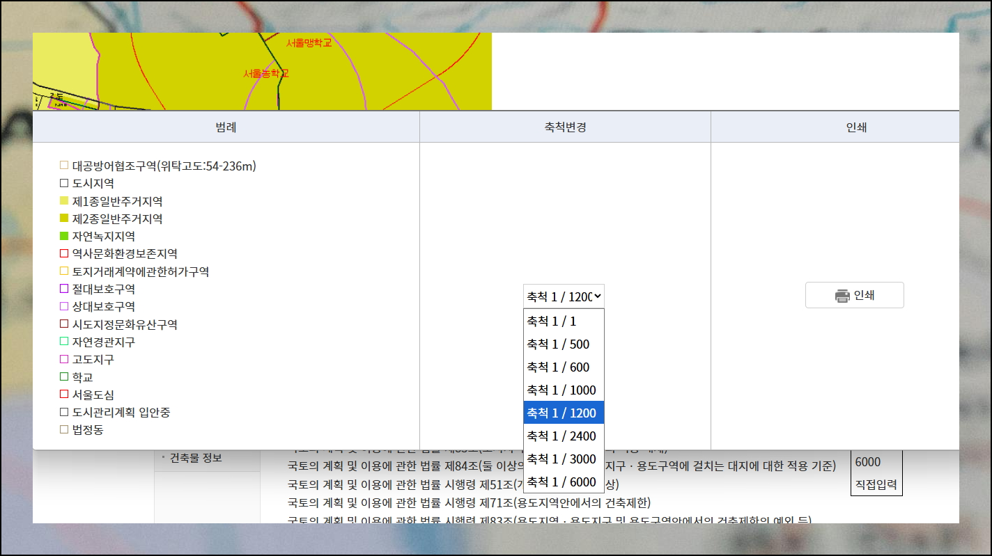 지적도에서 "도면 크게 보기" 기능을 활용하면 더 넓은 시야로 지적도 분석이 가능합니다. 축척 조정도 자유롭게 할 수 있어요. 범례에 표시된 고도지구, 정비구역, 일반 철도 등의 항목들을 참고하면 해당 지역과 주변 환경을 더욱 정확하게 이해할 수 있습니다.
