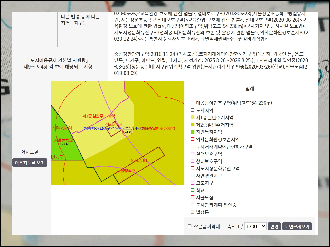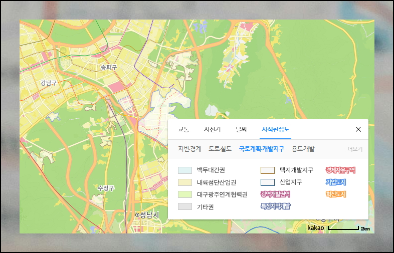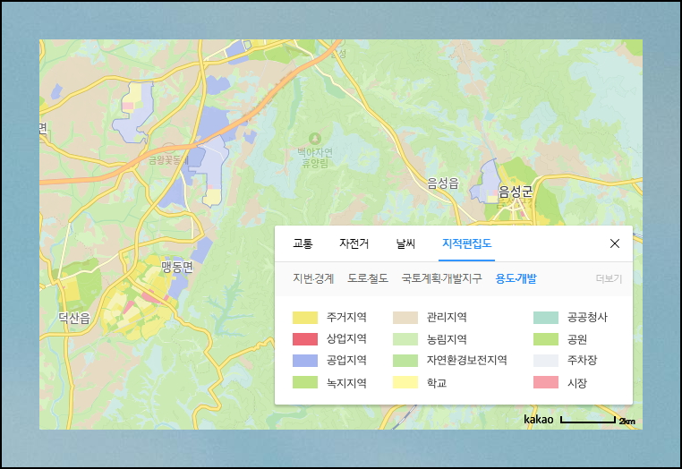 지적도 화면에서 용도 및 개발 메뉴를 활성화하면 각 지역의 성격을 색상으로 구분해서 보여줍니다. 주거지역과 상업지역을 한눈에 구별할 수 있고요. 공업지역, 녹지지역, 관리지역, 농림지역은 물론 시장, 주차장, 공원까지 다양한 시설이 서로 다른 색으로 지적도에 표시가 돼요.