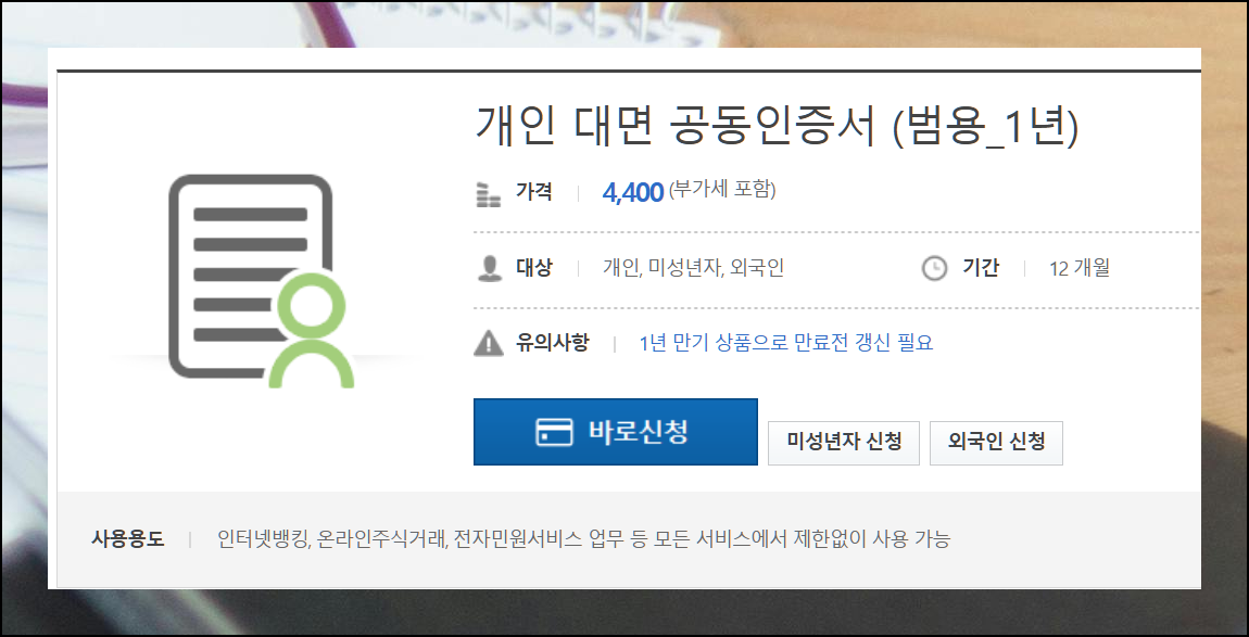 공인인증서 중에서도 범용 버전은 4400원이라는 약간의 비용이 들지만, 그만한 가치가 있습니다. 인터넷뱅킹부터 주식거래, 전자민원까지 거의 모든 온라인 서비스에서 사용할 수 있어요. 한국정보인증의 범용 상품은 디지털 생활의 만능 열쇠라고 할 수 있죠.