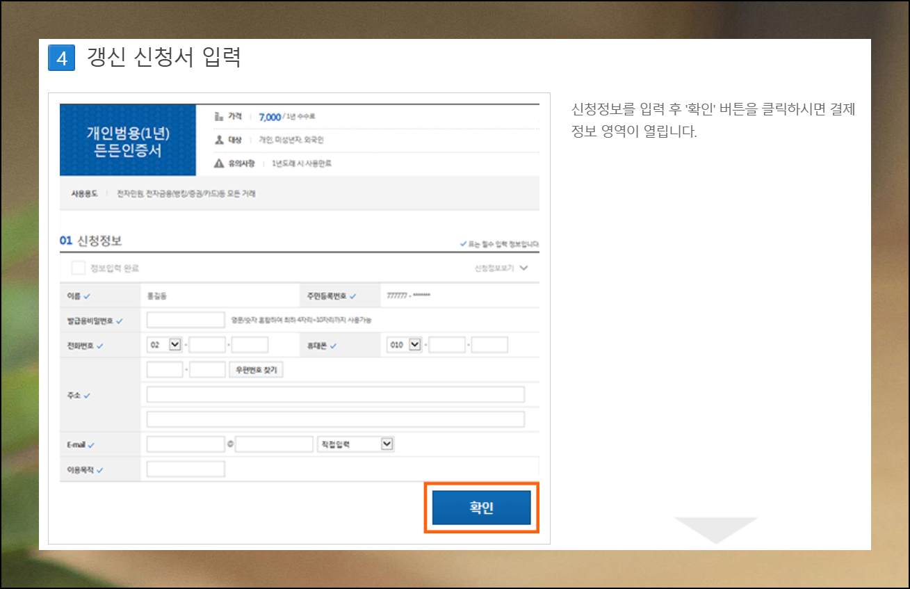 갱신에 필요한 정보는 최소한으로 구성되어 있습니다. 발급용 비밀번호와 연락처 정보, 그리고 이용목적만 입력하시면 되요. 복잡한 서류나 절차가 필요하지 않아 편리합니다. 공인인증서 발급이 이렇게 간단해진 것은 시스템이 많이 개선되었기 때문이에요.