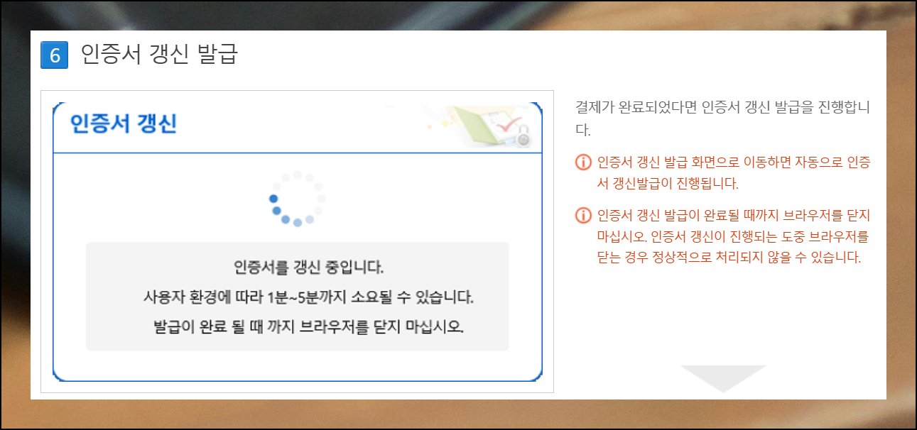 모든 정보를 입력하고 수수료까지 납부하시면 곧바로 갱신이 시작됩니다. 컴퓨터 환경과 능숙함 정도에 따라 1분에서 5분 정도 소요되는데요, 이 때 가장 중요한 것은 브라우저를 끄지 않는 것입니다. 한국정보인증의 안내에 따라 조금만 기다리시면 새롭게 갱신이 된 공인인증서를 받으실 수 있어요.