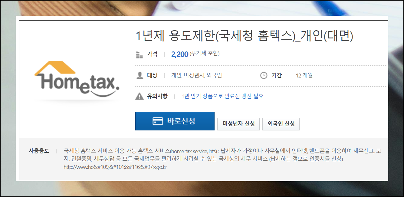 세금 관련 업무만 보신다면 더 저렴한 선택지가 있습니다. 국세청 홈택스용 공인인증서는 부가세 포함 2200원으로, 범용 상품의 절반 가격이에요. 세금 업무에 특화된 서비스를 원하신다면 이것도 좋은 선택이 될 수 있습니다.