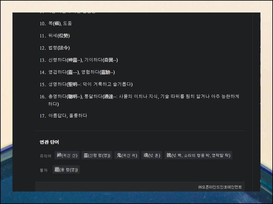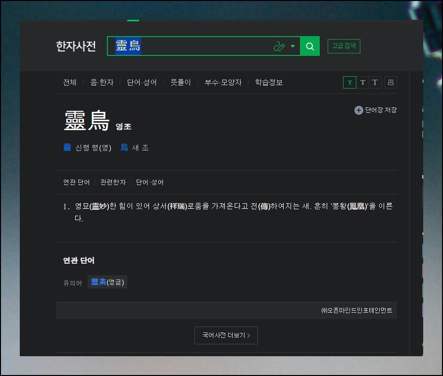 선조라는 표현을 넣어 실험을 진행했어요. 개별 한자마다 지닌 의미를 낱낱이 살펴볼 수 있습니다. 해당 표현 전체에 관한 상세 해석도 곁들여 나와요. 한글 풀이 덕분에 낯선 글자라도 받아들이기 편합니다. 속뜻까지 깊이 있게 파악이 됩니다.