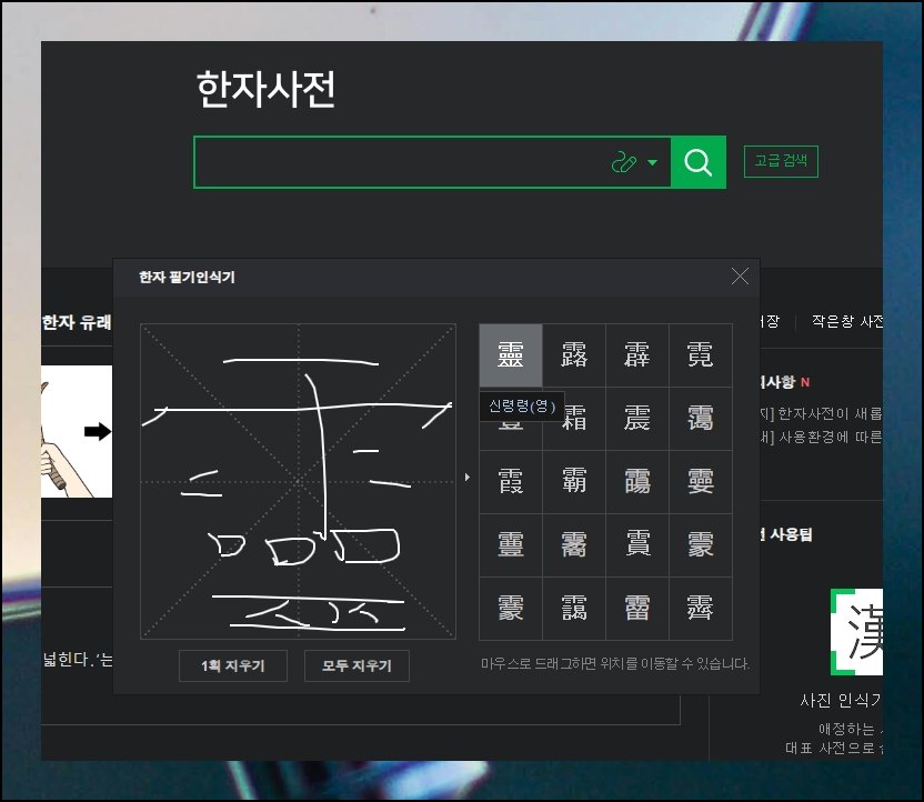 거꾸로 된 방식의 조회도 지원돼요. 원문을 놓고 한글 발음과 뜻풀이를 역으로 한자찾기 가능합니다. 손글씨 인식 아이콘을 누르고 포인터로 직접 그려 넣어보세요. 구조가 까다로운 글자라도 이 방식이면 손쉽게 잡아낼 수 있습니다.