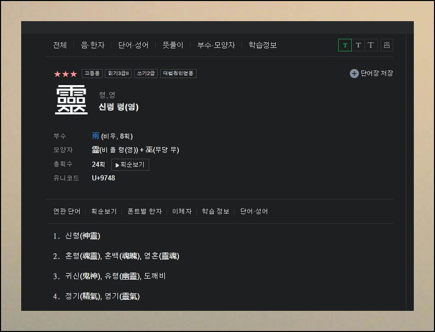 특정 글자의 세부 정보 화면을 펼쳐보세요. 구성 요소와 획수, 학습 수준까지 갖가지 항목이 빈틈없이 갖춰져 있습니다. 한글로 된 설명이 함께 제공되어 궁금했던 사항을 한 곳에서 전부 해소할 수 있어요. 여기저기 돌아다닐 필요가 없습니다.