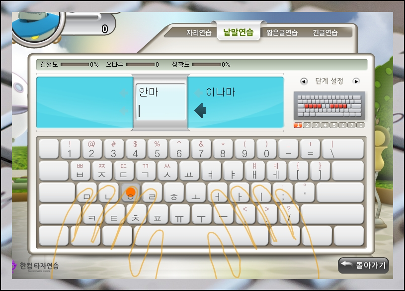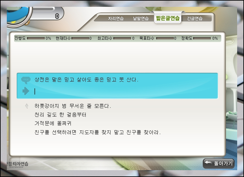 낱말, 짧은글, 긴글을 가지고도 연습도 가능한데요. 진행도, 오타수, 정확도, 최고타수와 같은 통계지표가 실시간으로 표시되기 때문에 이용하기에 정말 좋습니다.