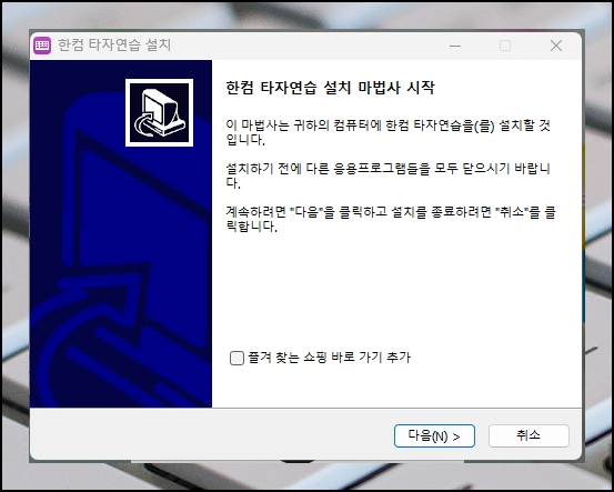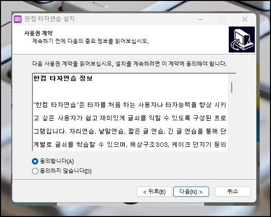 이곳에서 제공하는 한글타자연습 프로그램은 2가지가 존재하는데요. 첫 번째는 (구) 한컴 타자연습으로 프로그램을 설치해야 이용할 수 있는 버전입니다. 두 번째는 온라인 버전인데요. 설치 없이 바로 사용할 수 있다는 장점이 있죠. 일단 첫 번째를 먼저 소개해 드릴게요. 일단 다운로드 버튼을 누른 후 무료설치를 진행해 주세요. [다음] 버튼만 누르면 될 정도로 쉽게 진행할 수 있습니다.