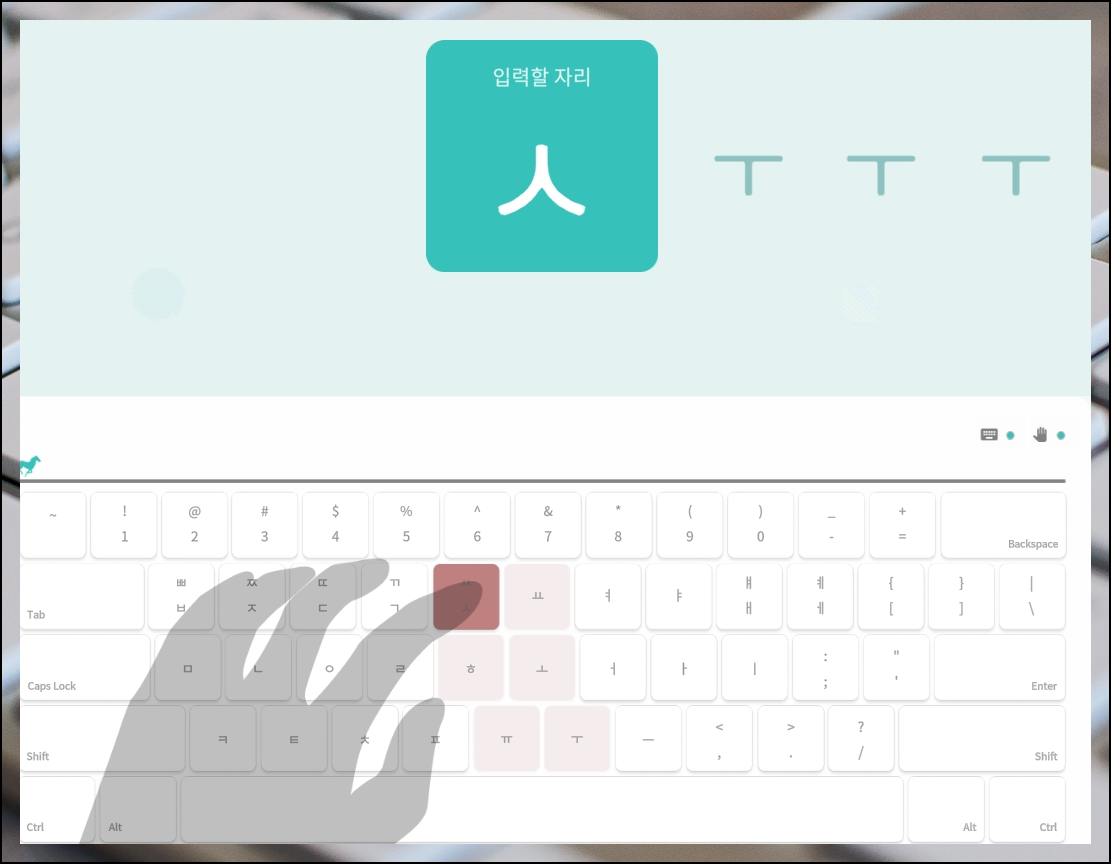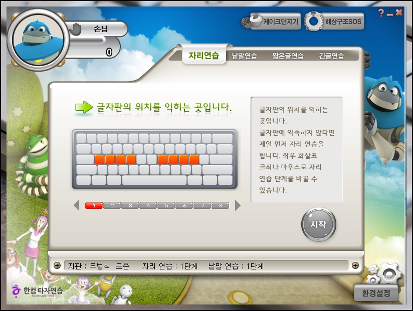 무료설치가 완료되면 한글타자연습을 실행해 보세요. 그럼 다음과 같은 화면이 나타나는데요. 사용자 등록을 해도 되고, 그냥 [시작] 버튼을 눌러도 됩니다. 여러 사람이 함께 사용하는 컴퓨터인 경우에는 사용자 등록을 하는 것이 좋아요. 프로그램이 열리면 가장 먼저 해야 할 것은 "자리를 익히는 것" 입니다. 글자판의 위치를 제대로 익힐 수 있죠.