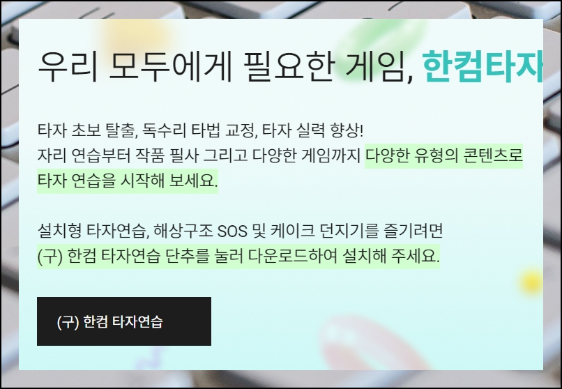 국내에서 많이 사용하는 워드프로세서 중에는 "아래아 한글"이 있는데요. 해당 소프트웨어를 제작한 곳에서 무상으로 제공하는 한글타자연습 프로그램을 이용해 보세요. 보시는 바와 같이 타이핑 실력을 키울 수 있는 게임도 2가지나 제공하고 있는데요. 재미 있게 실력을 키울 수 있습니다.