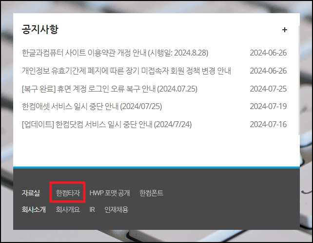 그럼 어떻게 한글타자연습 프로그램을 구하는지 알려드릴게요. 해당 프로그램 다운 및 무료설치를 위해서는 "한컴" 사이트에 접속해야 합니다. 이곳에 접속하면 바로 화면을 쭉 아래로 내려보세요. 그럼 자료실 메뉴 옆에 "한컴타자"가 있습니다.
