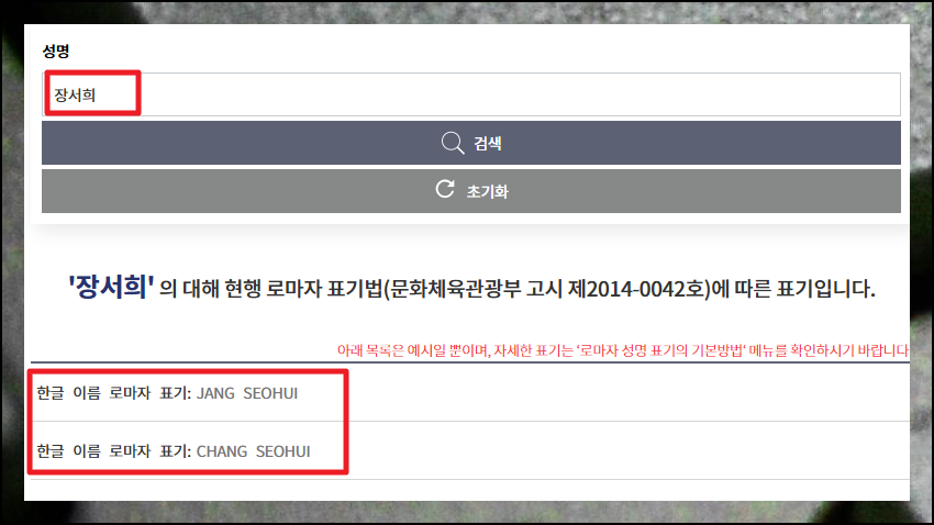 인터넷에서 우리가 찾은 영문표기를 검색해보세요. 그럼 "Seohee Chang" 또는 "JANG SEOHUI"를 사용하는 경우를 발견할 수 있습니다. 이는 실제로 이런 표기가 활용되고 있다는 좋은 예시가 되죠. 이런 식으로 변환 방법에 따라 만들어진 이름이 실제로 어떻게 쓰이는지 직접 확인할 수 있답니다.