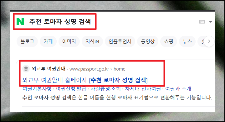 검색을 통해 "추천 로마자 성명 검색" 서비스를 찾아 접속해 주세요. 한글이름을 간편하게 영문 표기로 바꾸어 주는 시스템입니다. 외교부 사이트에서 제공하는 것으로써 로마자 표기법을 준수하기 때문에 정확도 또한 높습니다. 변환 방법이 간단해서 누구나 쉽게 따라할 수 있답니다.