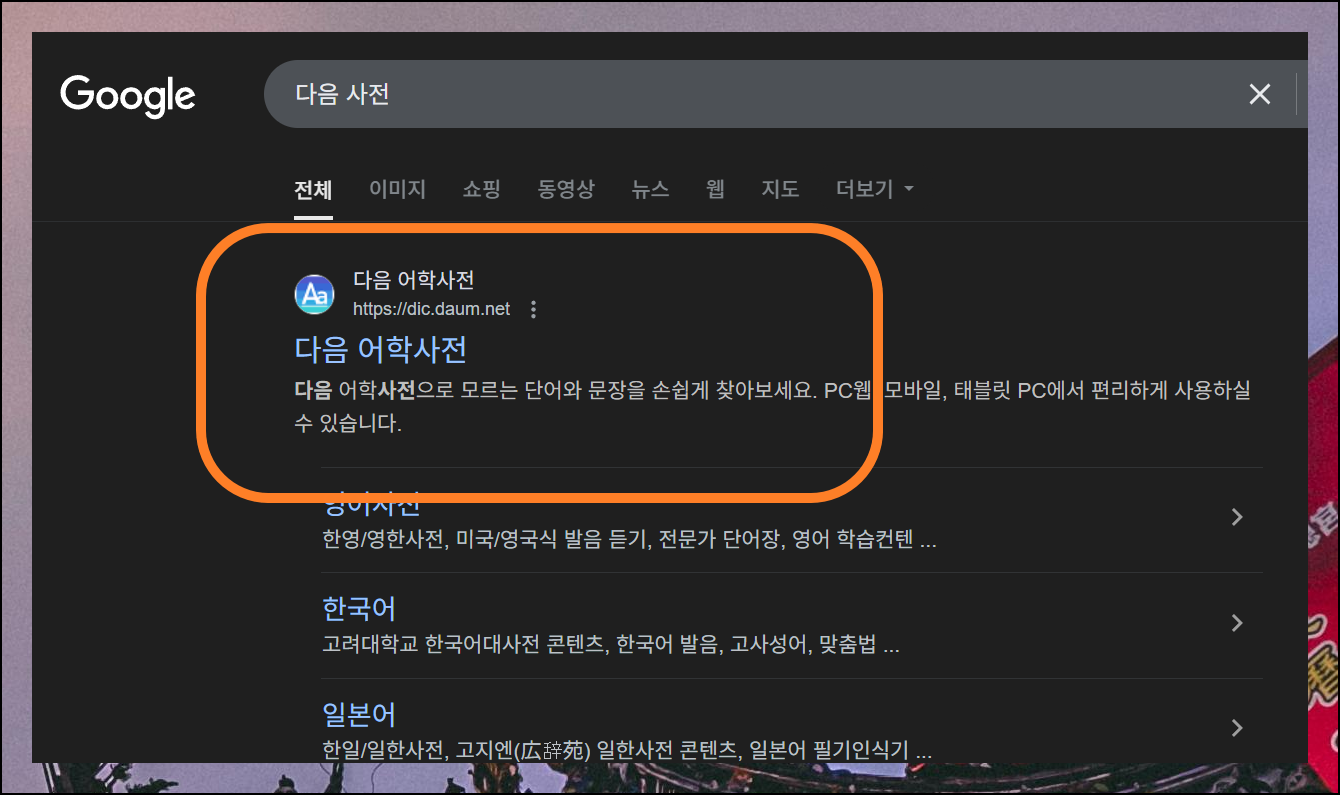 첫 번째 방법은 정말 쉬웠죠. 이번에는 인터넷 서비스를 이용한 방법을 설명 드릴게요. 다음 포털사이트에서 제공하는 사전 기능을 활용하는 방식이에요. 다음 홈페이지에 접속한 후 상단 메뉴에서 "사전"을 찾아 클릭해보세요.
