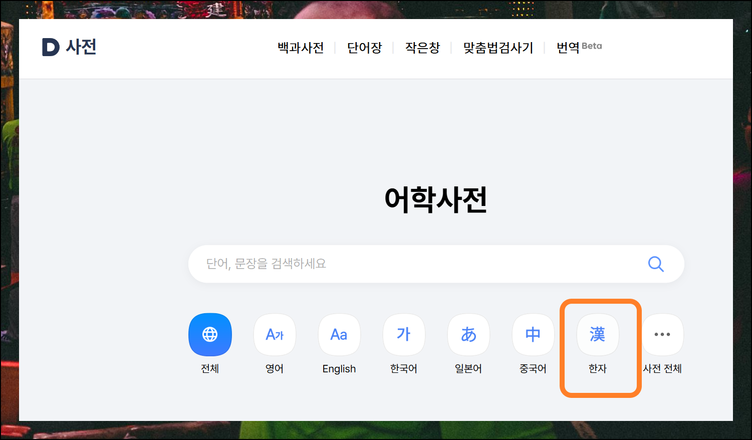 다음 어학사전 페이지로 이동하게 돼요. 여기서 한영사전, 영영사전, 국어사전, 중국어사전, 일본어사전 등 여러 옵션을 볼 수 있어요. 이 중에서 "한자" 또는 "한문"이라고 표시된 부분을 선택해주세요.
