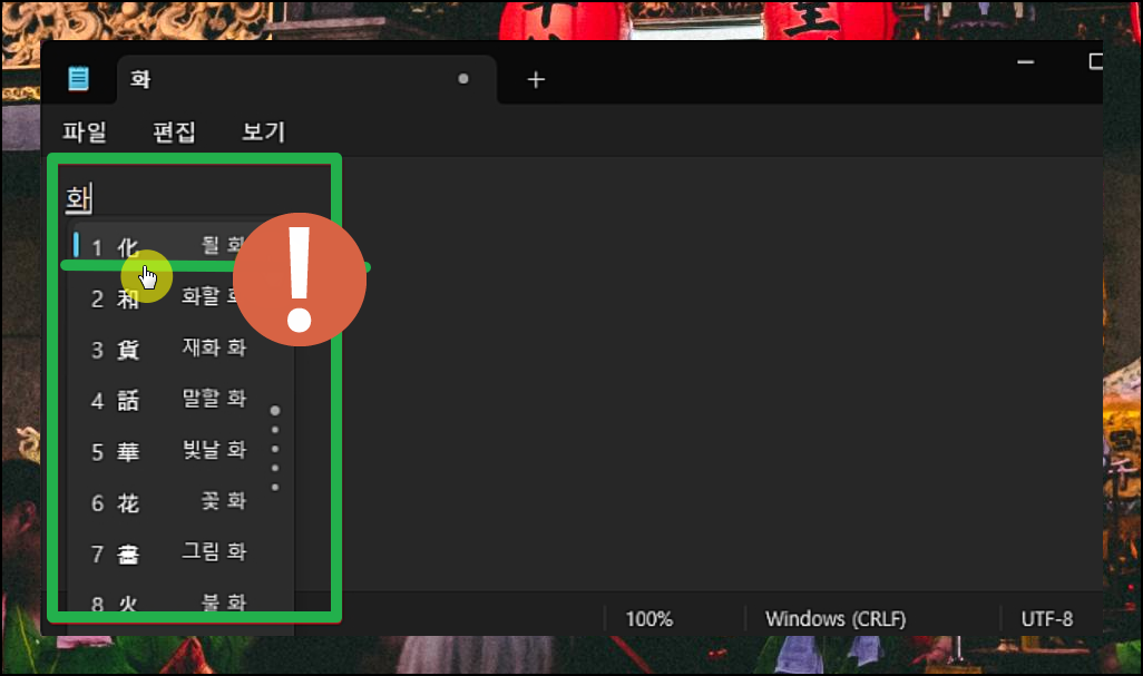 화면에 같은 발음을 가진 다양한 한자들이 목록으로 나타날 거예요. 이 중에서 바꾸기 원하는 것을 마우스로 클릭하거나 좌측에 붙여진 숫자키를 누르면 됩니다.
