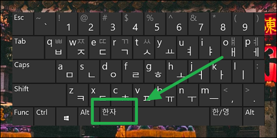 키보드마다 변환키 위치가 조금씩 달라요. 대부분 "한자"라고 적혀 있는 키를 찾으면 됩니다. 만약 이런 표시가 보이지 않는다면 키보드 오른쪽에 있는 Ctrl키를 눌러보세요. 이 키가 한글을 한자로 바꾸기 역할을 하는 경우가 많으니 참고하시길 바랍니다.