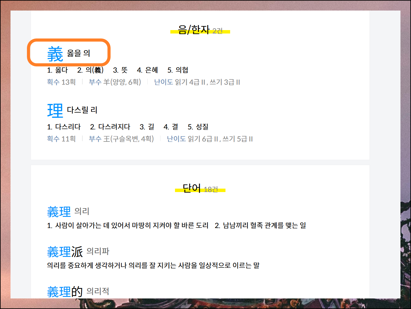 제가 "의리"라는 단어를 검색해 보았어요. 결과 화면에 "義理"라는 표기와 함께 각각의 문자 설명을 확인할 수 있었어요. 연관된 단어들도 18개 정도 나오네요. 각 단어의 의미도 상세하게 설명되어 있으니 관심 있는 부분을 클릭해보세요.