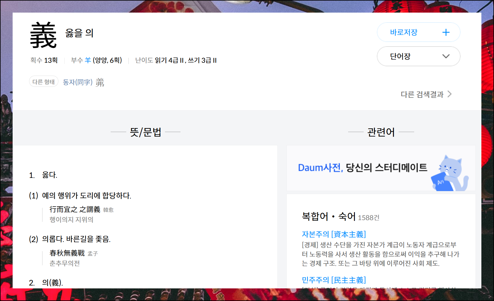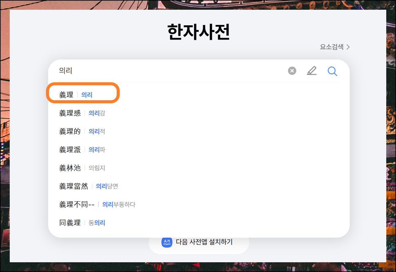 제가 "의리"라는 단어를 검색해 보았어요. 결과 화면에 "義理"라는 표기와 함께 각각의 문자 설명을 확인할 수 있었어요. 연관된 단어들도 18개 정도 나오네요. 각 단어의 의미도 상세하게 설명되어 있으니 관심 있는 부분을 클릭해보세요.