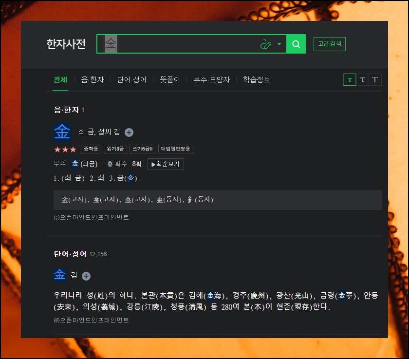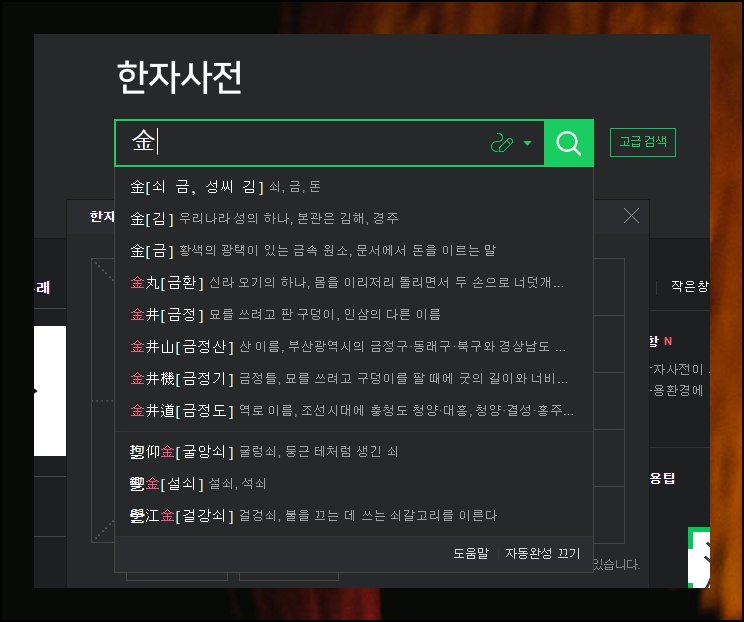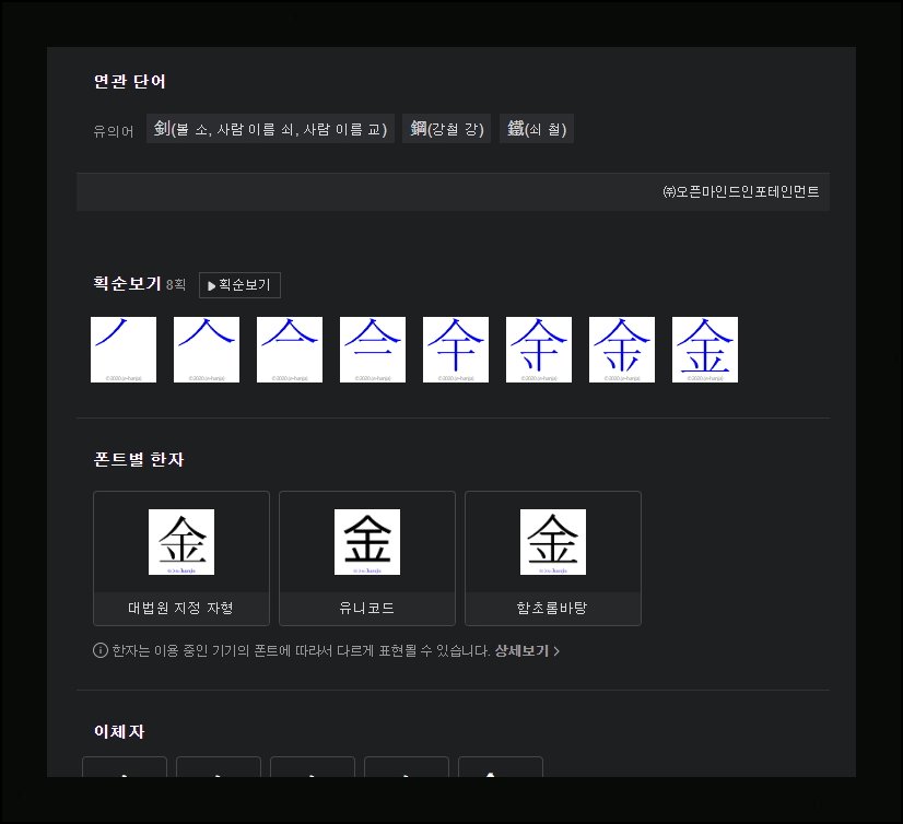 "이름 김"이나 "쇠 금"으로 불리는 문자를 검색해봤어요. 부수와 획수, 획순, 난이도 같은 기본 정보부터 다양한 의미 해설까지 확인 가능해요. 글자 하나를 써서 입력해서 이렇게 상세하고 풍부한 정보를 얻을 수 있습니다. 특히 관련된 단어와 고사성어도 꽤 많이 찾기 가능해요. 학습용으로 사용하기에도 충분합니다.