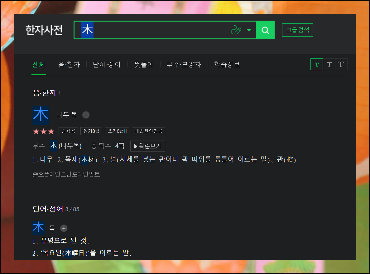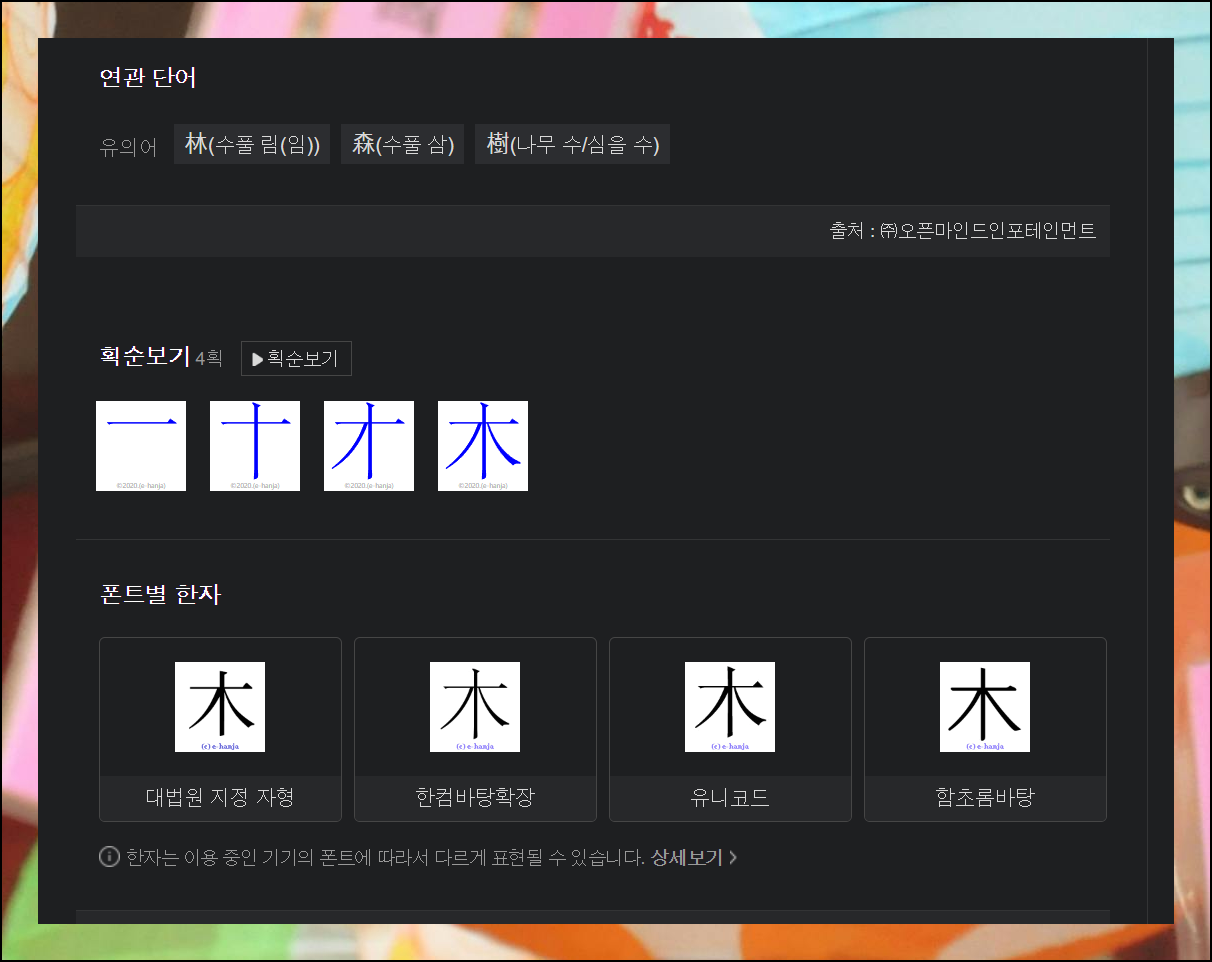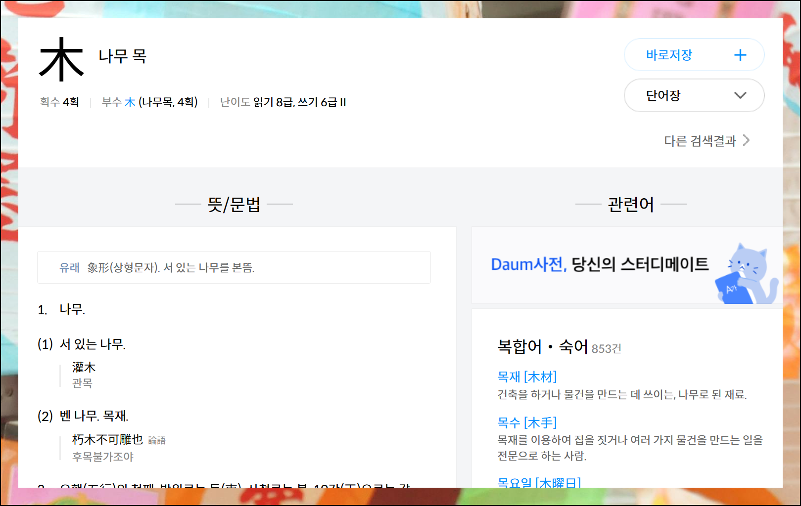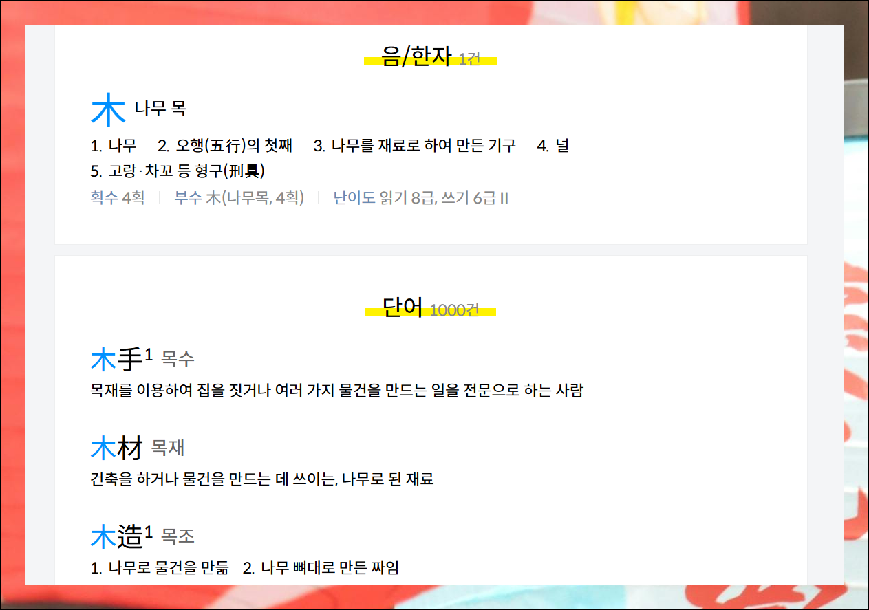 원하는 한자를 검색창에 입력한 후, "검색" 버튼을 누르면 결과가 표시됩니다. 해당 글자는 물론, 이 문자가 포함된 단어도 살펴볼 수 있어요. "나무 목"자를 입력했더니 관련 표현이 1000건이나 나왔습니다.