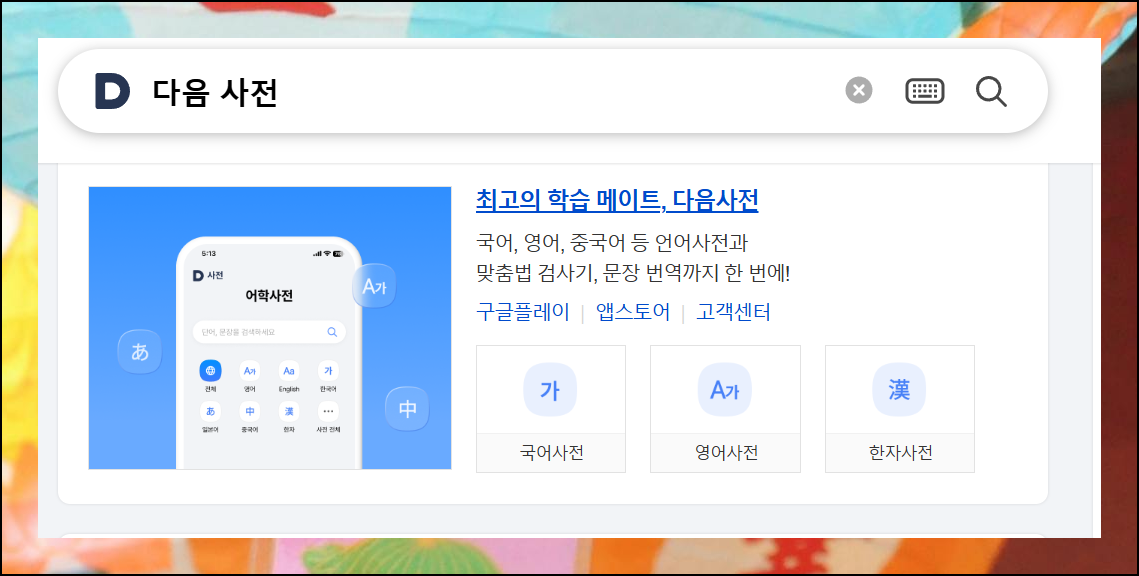 다음에서 운영하는 어학사전 사이트에 접속하면 다양한 언어 서비스를 이용할 수 있어요. 한영사전부터 중국어까지 여러 언어 사전이 준비되어 있습니다. 검색 결과에 나온 3번째 메뉴를 선택해 보세요. 바로 온라인 옥편 찾기 서비스가 열립니다.