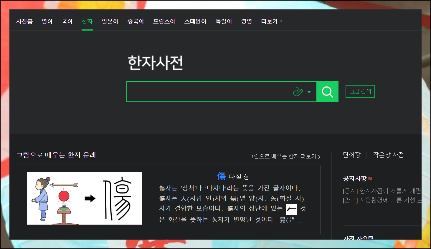 네이버 사전 메인화면을 보면 한문 학습을 할 수 있는 서비스가 제공되고 있어요. 한문을 배우려는 분들에게 매우 유용한 자료들이 풍부합니다. 여기서도 검색창에 있는 "필기 아이콘"을 눌러 인식기를 켜주세요.