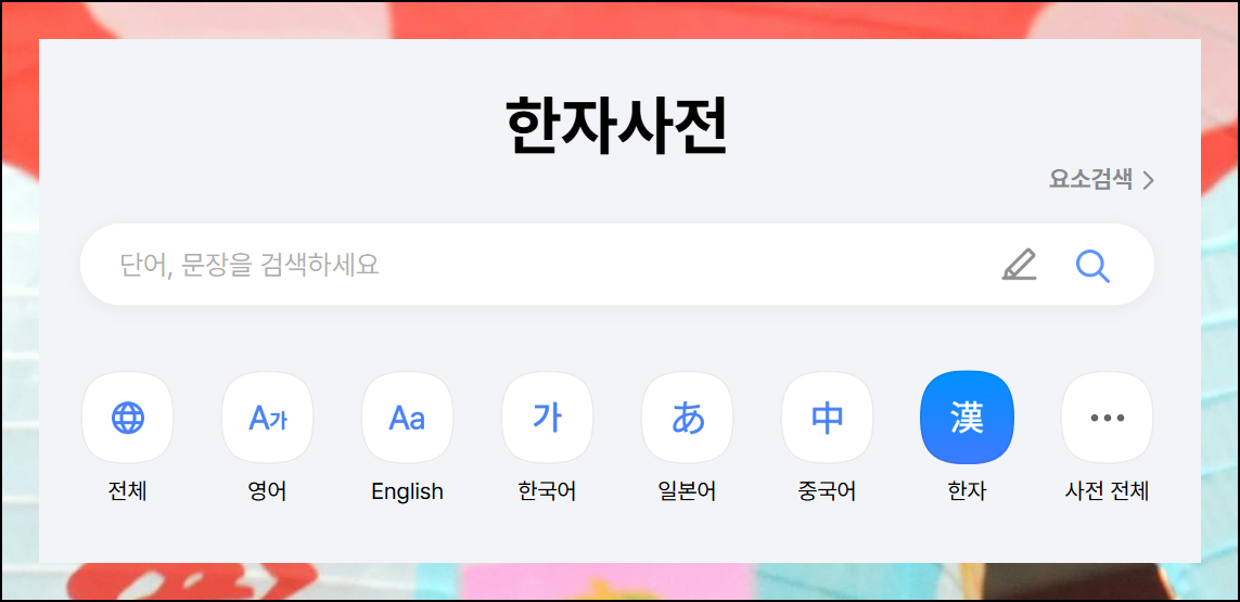 가장 편리한 옥편 찾기 방법은 "필기인식" 기능을 사용하는 것이에요. 검색창에서 오른편에 배치가 되어 있는 버튼을 클릭하면 "한자 필기인식" 도구가 나타납니다.