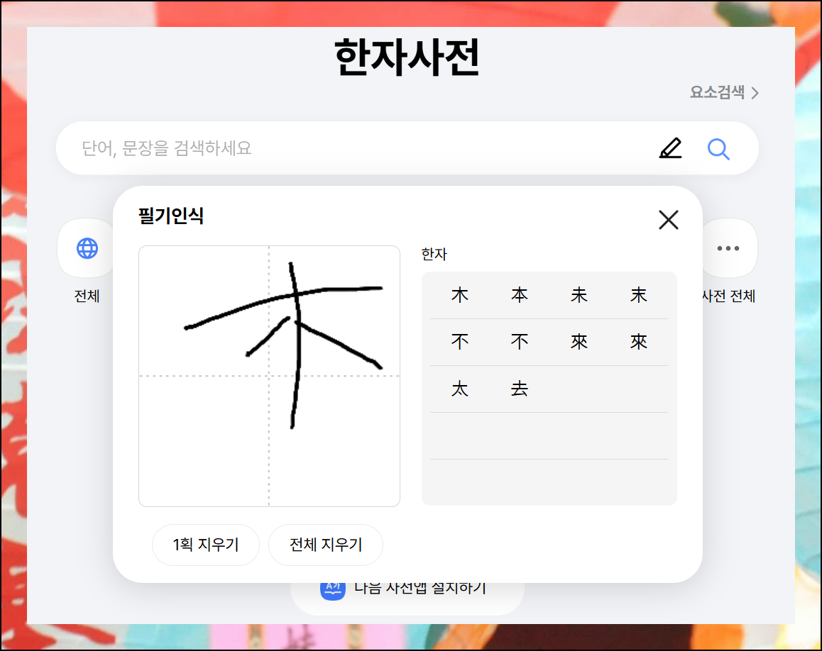 마우스로 찾고자 하는 문자 모양을 그려 넣고, 오른쪽에 표시되는 선택지 중 원하는 문자를 클릭하기만 하면 돼요.