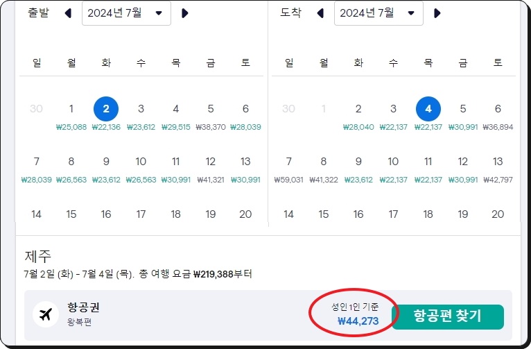 검색 버튼을 누르면 이번에는 달력처럼 생긴 가격표가 나타납니다. 각 날짜에 구입 가능한 항공권의 최저 금액인데요. 아무래도 최저가가 낮을수록 그날에 판매되는 티켓을 싸게 살 확률이 높습니다. 본인의 여행 스케쥴을 감안하여 출발 및 도착 날짜를 선택해 주세요. 제 경우에는 왕복 비행기표가 45,000원 수준으로 꽤 저렴하게 나온 티켓을 찾았습니다.