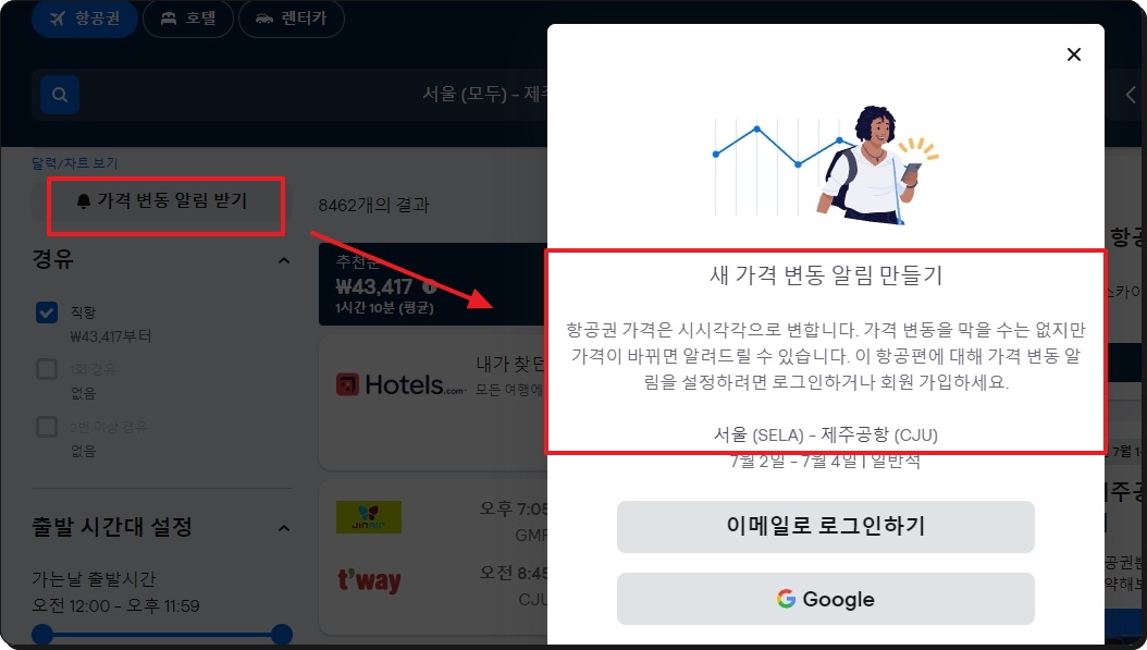제가 알려드린 방법을 제대로 따라했음에도 불구하고, 원하는 만큼 싸게 구입하지 못했다면 추가적으로 사용할 수 있는 방법을 따라해 보세요. 바로 "알림" 기능을 이용하는 것인데요. 이를 통해 내가 찾았던 것보다 싸게 나온 티켓이 생기면 알림을 받을 수 있습니다.