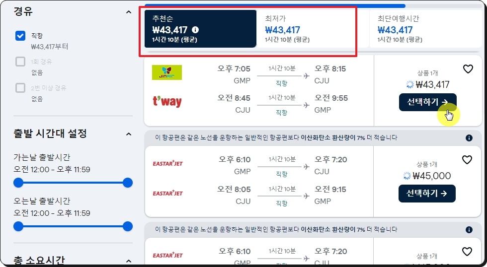 이번에는 비행기 탑승 시각과 항공사를 정할 차례인데요. 같은 날 출발하고, 같은 날 돌아오는 비행기표라도 탑승 시각에 따라 요금에서 차이가 있습니다. 아무래요 수요가 많은 항공권의 가격이 높고, 반대의 경우에는 싸게 판매가 되겠죠. 출발 시간대까지 정했다면 리스트에서 [선택하기] 버튼을 누릅니다.