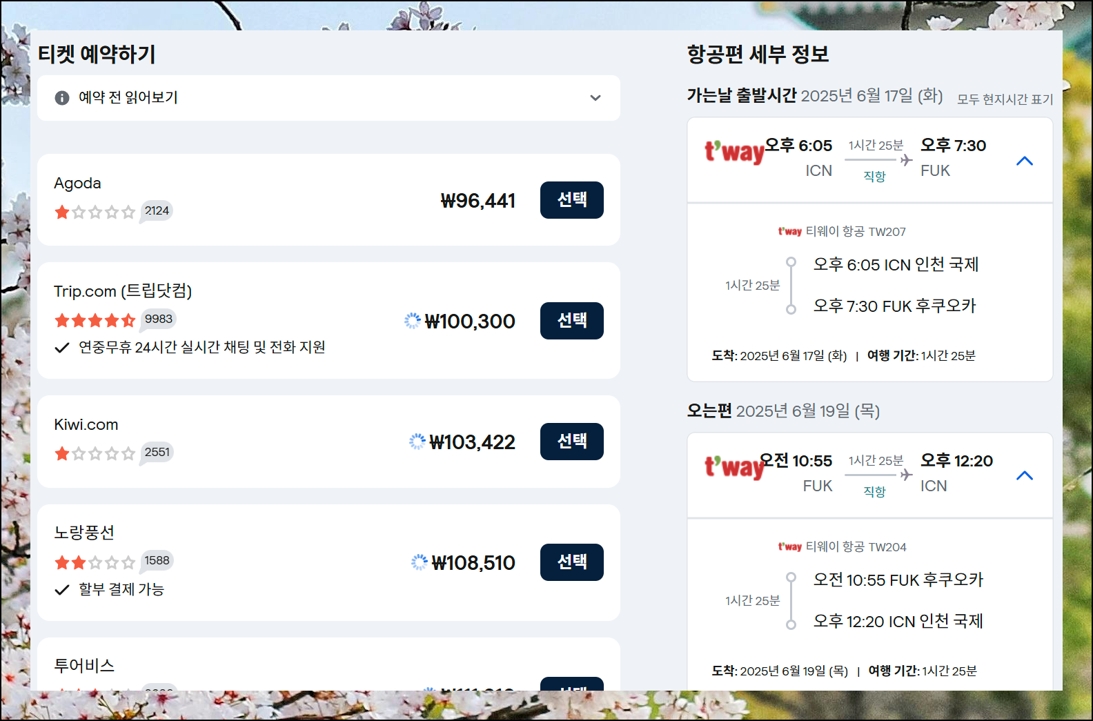 마음에 드는 항공권을 찾았다면 예약 업체를 선택할 차례입니다. 일반적으로 검색 결과 상단에 나오는 여행사가 가장 저렴한 가격을 제시해요.