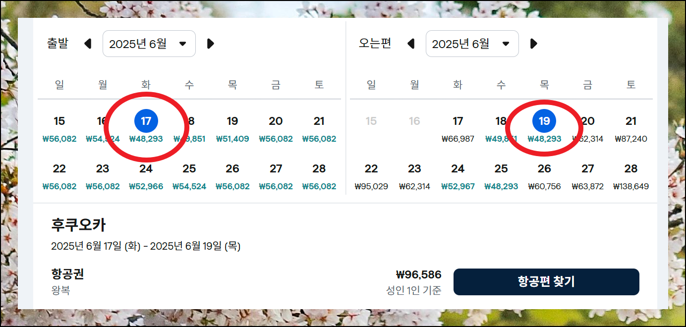 6월 17일 출발에 19일 귀국으로 설정하면 꽤 저렴하게 항공권을 구입할 수 있는데요. 가장 경제적인 여행을 위해서는 왕복 항공료의 총합이 최소가 되는 조합을 찾아야 합니다. 일정을 하루나 이틀 조정하는 것만으로도 비용이 크게 변할 수 있으니까요.